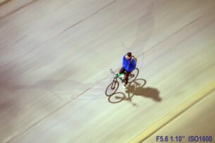 - Diego Zagaglia: Tranquila (Grupo de FB #LaEscuelaDeFotografía). Un barrido bastante interesante y muy bien conseguido. Que haya tan pocos elementos le viene muy bien a la imagen, así como el movimiento sugerido por el fondo, por el barrido. Creo que descentrando más a la ciclista se podría haber creado una imagen todavía más dinámica, usando las líneas diagonales. Y aunque la intención es buena, no me gusta ver ahí, en la imagen, los datos EXIF 😉 ¡Muy bien capturada! 🙂