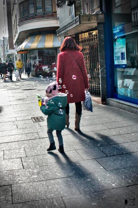 - Pruden Montiel: Estela mágica (Grupo de FB #LaEscuelaDeFotografía). Una de esas imágenes que se pescan, que hay que perseguir. Me imagino a Pruden, atraído por la imagen de la niña y siguiéndola, hasta que mira hacia atrás con un gesto un tanto pícaro y cómplice 😉 La inestabilidad que muestra el encuadre, no perfectamente estabilizado, nos acerca al movimiento de la escena, a la inquitud de la niña ¡Bien vista y bien lograda Pruden! ;)