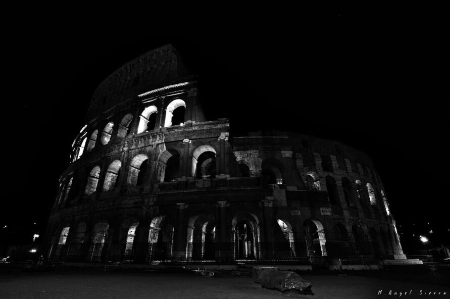 - Miguel Ángel Simarro: Colosseo (Grupo de FB #LaEscuelaDeFotografía). Para mi una imagen a la par de la ganadora. Me parece muy acertado haber expuesto para las luces para ocultar muchos detalles de este emblemático monumento. No he estado en el lugar, pero me imagino que habrá muchas luces en el lugar y controlar la luz será complicado, por eso me parece muy acertada la elección de la exposición. En este caso Miguel Ángel ha optado por la versión en blanco y negro, es fácil que de esa forma pueda quitar el efecto de luces con distinta temperatura de color, pero para este tipo de monumentos, el color si se consigue controlar, también aporte interés. Aunque el blanco y negro no desmerece al aportar un punto más de abstracción. Por comentar algo quizás mejorable, en el primer plano hay cierta iluminación que nos muestra algo, que no identifico y que no creo que aporte mucho. Pero sin ninguna duda, es una ¡Gran imagen Miguel Ángel! 😉