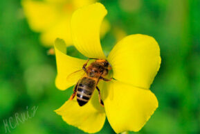 - Mari Carmen Ruiz: Polinizando (Grupo de FB #LaEscuelaDeFotografía). Una imagen macro nada fácil de conseguir, dónde el fondo combina a la perfección con el color principal, el amarillo, tema del reto. Incluso la figura de la abeja, con sus colores, negro y amarillo, combinan a la perfección con el resto de colores. El centramiento del sujeto principal y un correcto enfoque, funcionan muy bien para crear una bonita imagen de naturaleza. Y algo que no me convence, es el excesivo protagonismo visual de la firma, no soy nada amante de las firmas, y menos si tienen tanto impacto visual. Aunque eso no quita que sea una ¡Magnífica captura Mari Carmen! 🙂
