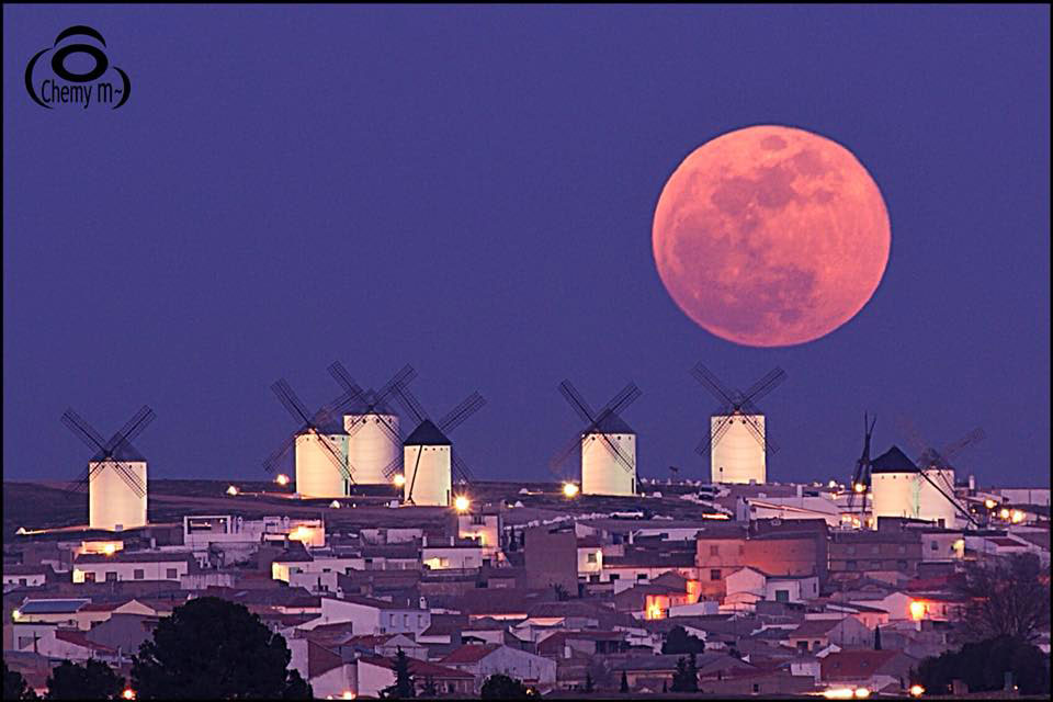 - Chemy Manzaneque: Súper Luna (Grupo de FB #LaEscuelaDeFotografía). Este tipo de imágenes no son nada fáciles porque exigen mucha planificación y tener todo listo para el momento oportuno, me gusta en este caso que la luna esté descentrada, creo que por la disposición del resto de la escena le dota de cierto dinamismo. El color de la luna, con tonos similares a los de la población y que armonizan con el color del cielo, al tiempo que contrasta con los molinos, me gusta. ¡Estupenda ejecución Chemy! 🙂