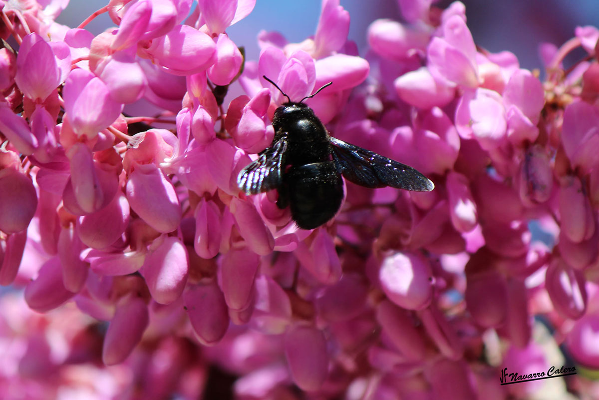 - Juan Fco. Navarro: Sin título (Grupo de FB #LaEscuelaDeFotografía). Una imagen similar a la de Emilio en cuanto a temática y los elementos, aunque diferente en formato del encuadre, composición y colores. En este caso Paco ha optado por una composición más centrada del sujeto que interés, que por color, contrasta muy bien con el resto de la imagen. Una imagen, por otra parte casi monocromática, porque el color morado de las flores, llena casi todo el encuadre, y lo poco que se ve el cielo, también es un tono frío, como es el azul. La luz en este caso dura y directa del sol nos habla de una estación y un momento de alegría en la naturaleza 🙂 ¡Estupenda imagen Paco! ;)